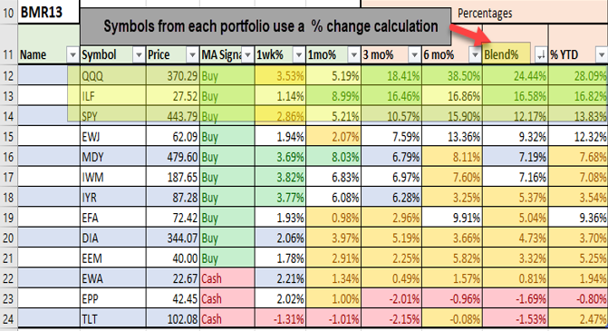 It took me about five seconds to find these symbols on Sunday. How? Data! I applied the calculations we used for our blended monthly rebalancing system to find the top three symbols for three different long-term portfolios. I knew that the formula for the blended monthly rebalancing systems use a simple blend of the 3-month and 6-month percent change performance of a group of symbols. It’s a great way to rank a set of symbols and quickly find what is outperforming its peer group. I’ve also found it’s an excellent way to find symbols in a strong uptrend on a higher timeframe like the daily charts.
